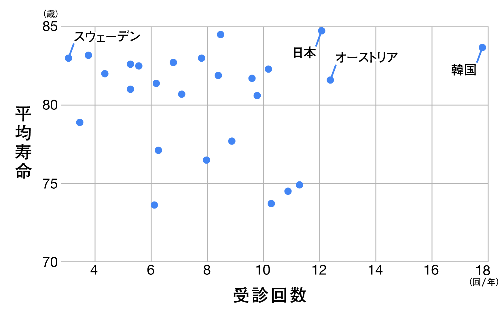 受診回数は3.1(スウェーデン)から17.8(韓国)まで実に6倍近い開きがあるが、平均寿命とはほとんど関係ないように見える。国によらず、人は命に関わりそうなことなら医師に見せるので、受診回数の差異を作っているのは主に放っておいても変わらないようなことなのだろう。そういう部分を過剰医療と呼ぶ人もいる。なお日本の受診回数は12.1と、韓国・オーストリアに次いで多い。