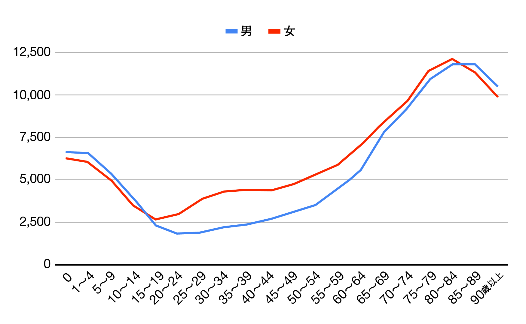 まして、三宅が性差として提示するものはごく小さい。「なぜ夫は病院に行かないのか」の第2回に引用された外来受療率で、三宅は「男2668人、女4358人」という数値を取り出している(40~44歳)。この性差が年齢階級によって違うことにも言及があるのだが、わかりやすくするためにグラフで表現してみよう。