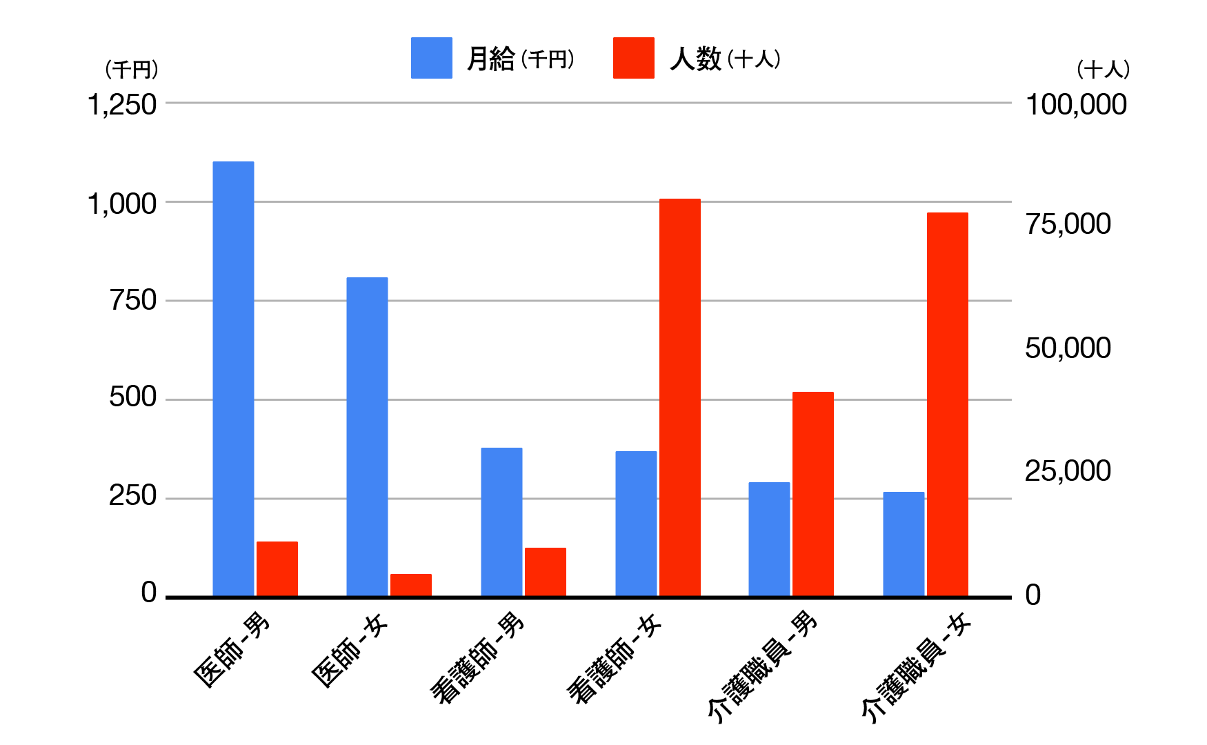 図は令和6年賃金構造基本統計調査による[★15]。医師は男性が多く高賃金であり、看護・介護は女性が多く低賃金であることが読み取れる。ぼくはこの格差が妥当なものだとは思わないが、これを受け入れなければ家計を支えられない女性が相当な人数でいるということだ。