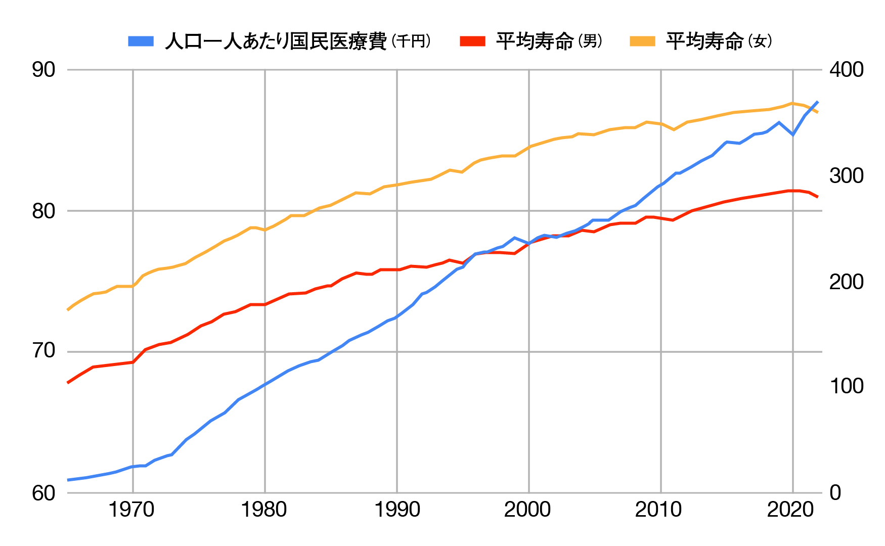 本稿のテーマである病院に絞って言うなら、医療費の増大は高齢化と同じかそれ以上に、医療の「高度化」が引き起こしていると語られる。しかしこの「高度化」とは単に費用が高くなったという意味であって、そのぶん飛躍的に治療効果が高まったわけではない。生命表によれば、平均寿命の伸びが近年になって加速したという事実はない[★16]。国民医療費[★17]とともにこれもグラフにしてみよう。