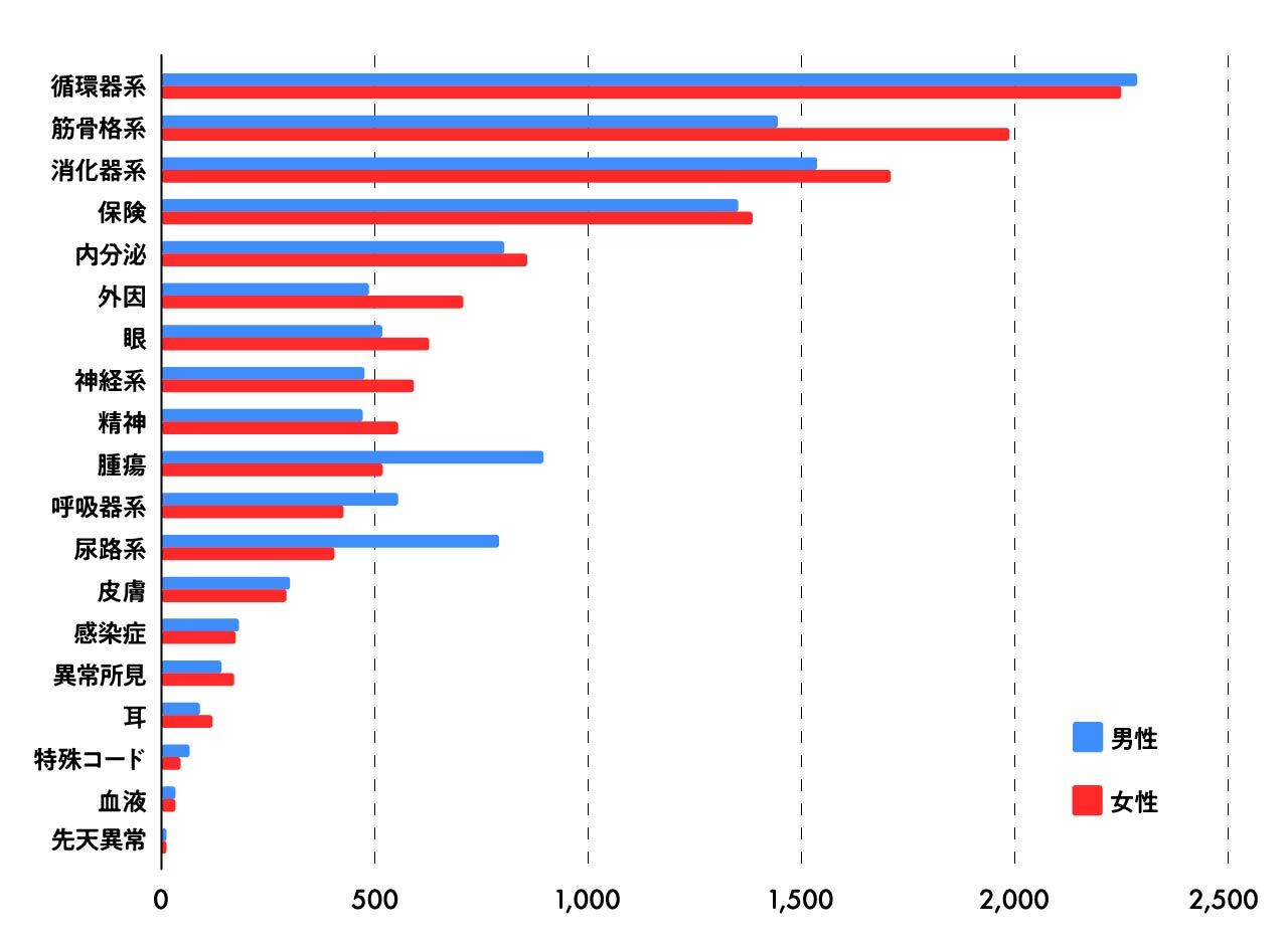 2023年の患者調査によれば、65歳以上の人口あたり推計患者数(調査日当日に、病院、一般診療所、歯科診療所で受療した患者の推計数)にはほとんど性差がない。その内訳の傷病分類、つまり病院に行く理由の上位も、「循環器系の疾患」「筋骨格系及び結合組織の疾患」「消化器系の疾患」など男女でおおむね似たものが並ぶ[図5]。