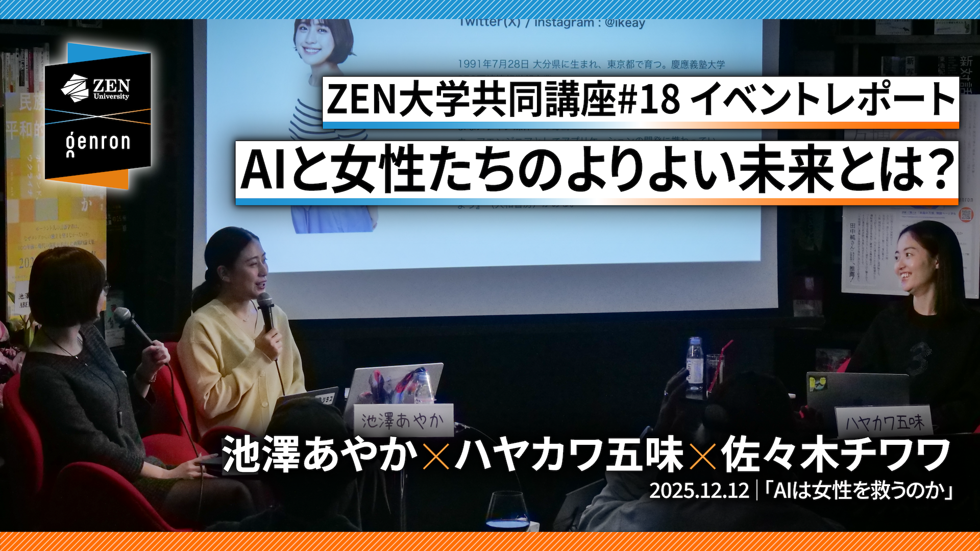 2025年12月12日、ZEN大学とゲンロンの共同公開講座第18弾として、AIと女性をめぐるトークイベントが行われた。登壇者は、ソフトウェアエンジニアでありタレントの池澤あやか、上場企業でAI活用推進を担当し個人でも発信を行うハヤカワ五味、歌舞伎町などの現場でAIを用いる若者たちのリサーチを続ける文筆家の佐々木チワワの3人である。
