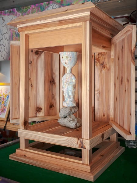 《なぎづち》はオリンピックの聖火リレーで用いられるトーチがイメージされていますが、像の頭の部分は静かに水をたたえる構造になっており、聖火とは真逆の意味を持っているかのようです。水は蒸発したり、陶に染み込んでいくことによって減っていくので、作品を飾っているあいだは気づいたときに水を継ぎ足さなければなりません。つまり、たびたびこの作品を思い出しては「ケア」する必要がある形態なのです。《なぎづち》のひとつは井戸博章さんが制作した木製の厨子の中に収められて展示されていて、西洋的な身体をしながらも。観音様やお地蔵様を思わせる、仏教的なたたずまいをしていました。