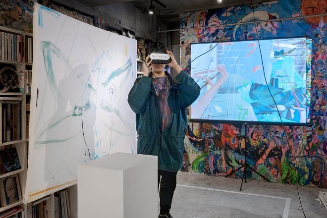 木村翔馬さんはVRシステムを経由して「絵画」を制作する、一風変わったスタイルで活動しています。木村さんはまず、ヘッドマウントディスプレイをつけ、両手に持ったコントローラーで、仮想空間上にボリュームをもったラインを描き、立体的にドローイングしていきます。VR上にできた「絵画」は上下左右から、拡大縮小をしながら自由に鑑賞が可能なのです。そしてさらに、その特殊な制作の感覚を、現実空間で再び平面の絵画作品に作り直します。一見して抽象形態でしかない図像は、そのプロセスを知った途端に、身体の軌跡であることに気付かされます。