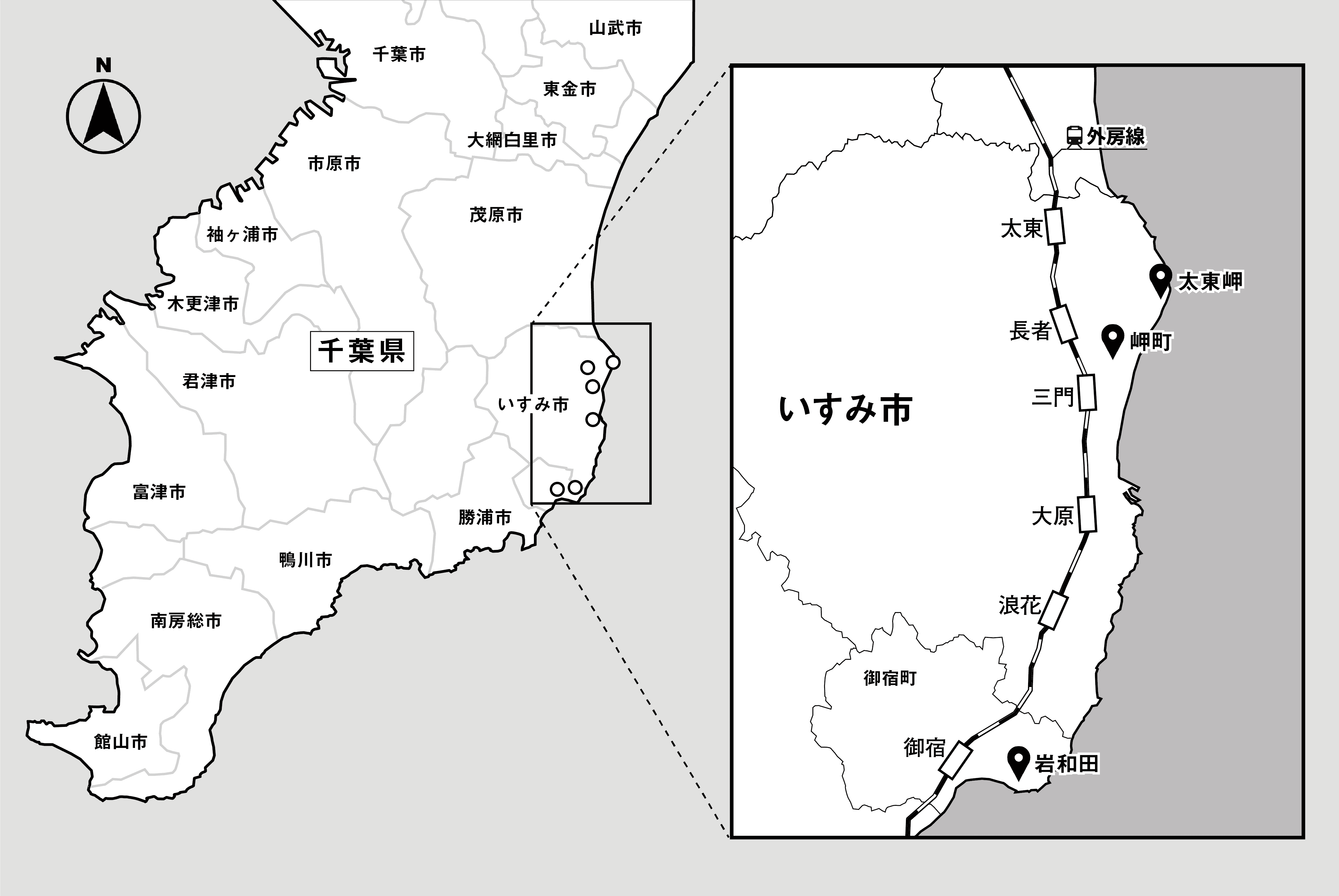 JR外房線は、三門の次、大原駅を過ぎたあたりからトンネルだらけになり、海岸線のすぐ背後に岩山が迫った世界になる。山側には農村が広がるが、海側には耕作地がほとんどなく、海が生活の中心となる。こちらは岬町界隈で行われた季節性漁業ではなく、網元が資本家、専業漁師が労働者、という経済構造になる。