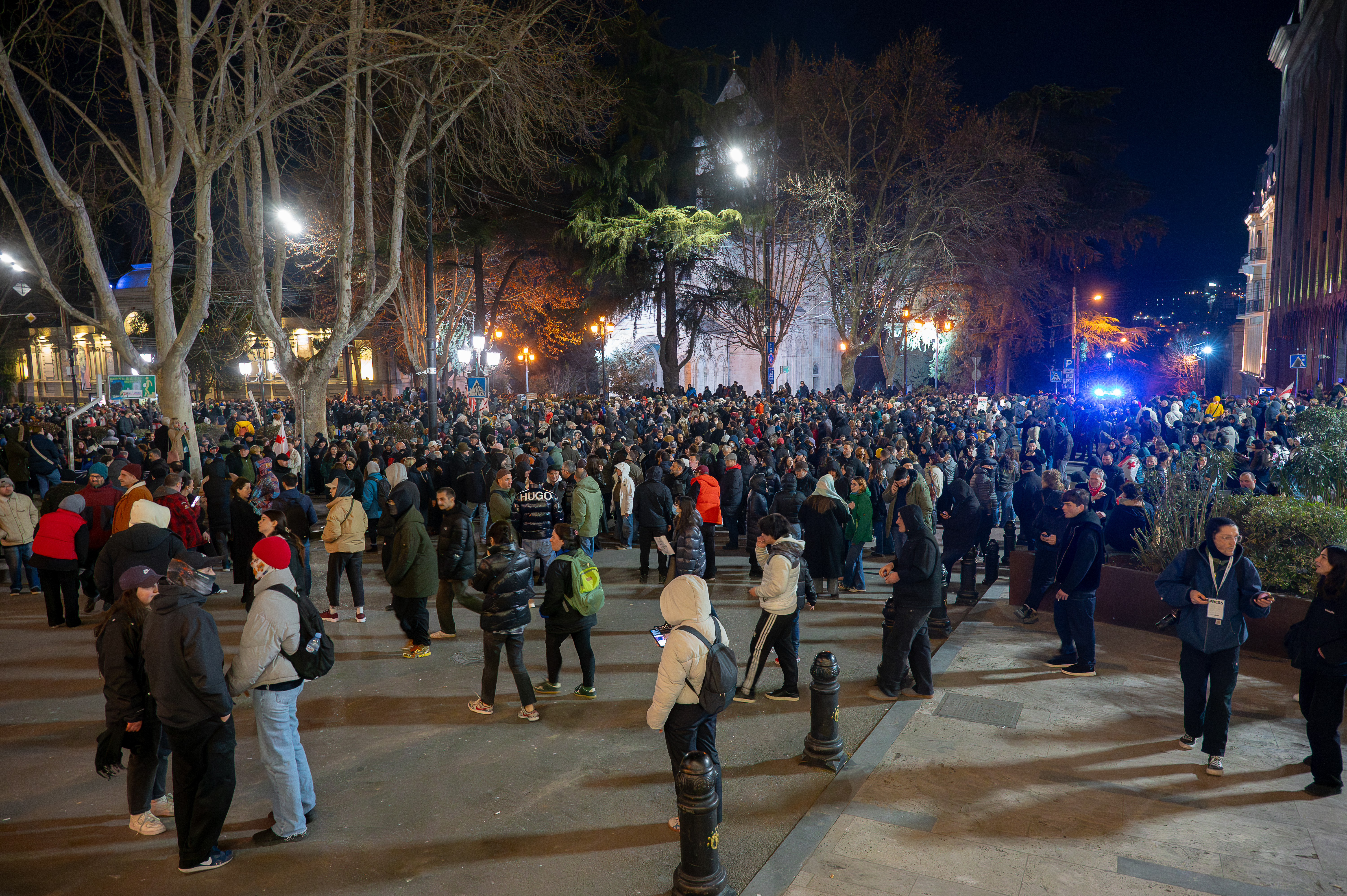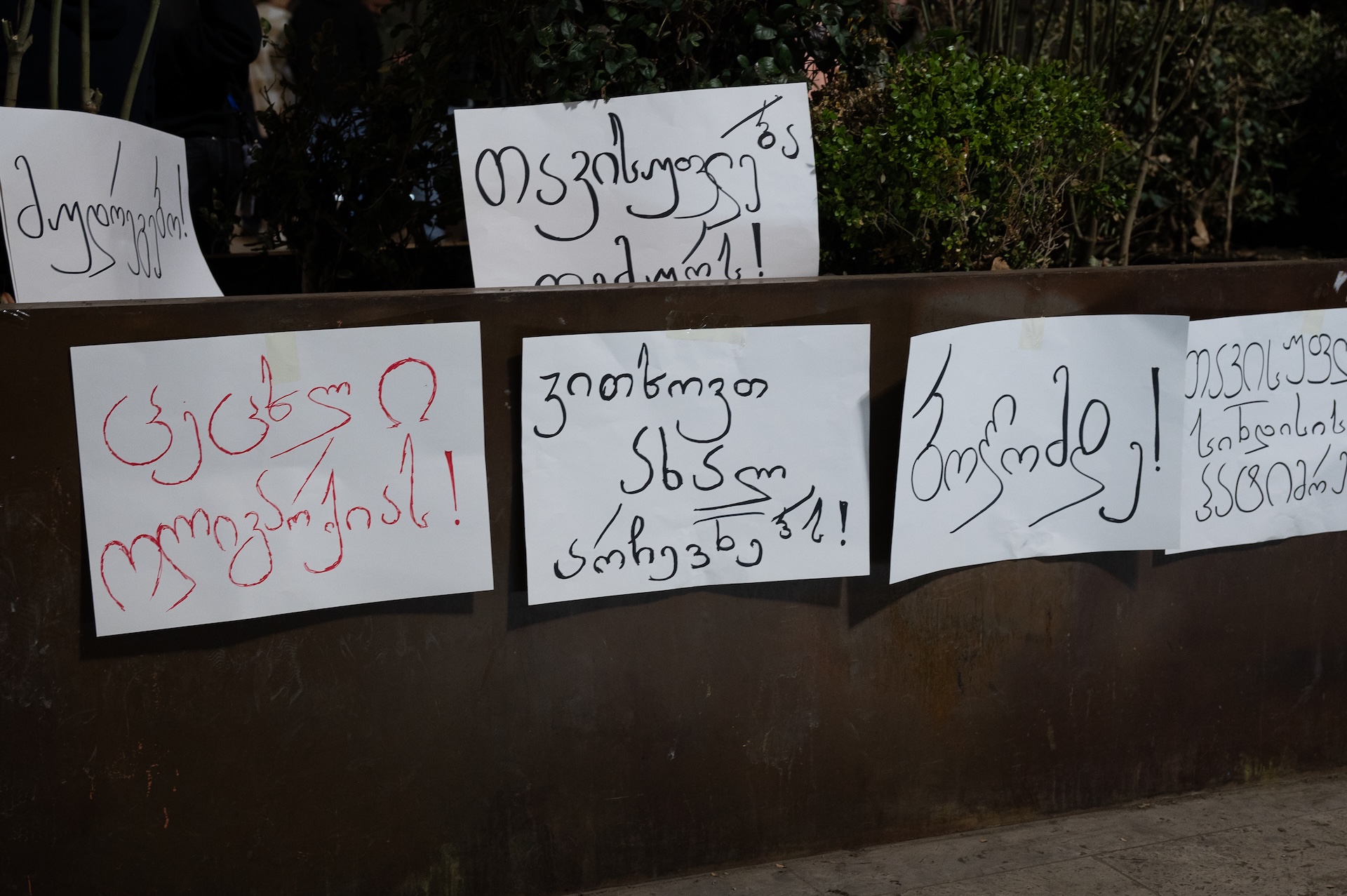 ここまで触れてこなかったが、このコンテクストとして、2024年10月26日に行われた国政選挙の不正疑惑と、11月28日にEU加盟交渉のジョージア側からの凍結に対して、首都トビリシの中心部で選挙のやり直しを求めて大規模な抗議集会が連日催されていた(本原稿を執筆している2025年8月下旬まで継続している)[図2・3]。抗議集会への機動隊の暴力的な対応は本邦でも報じられたとおりであり、またジャーナリストをはじめとする抗議者の逮捕が相次いだことで、ジョージアにおける民主主義の後退であると欧米各国は非難し、イヴァニシヴィリをはじめとする与党幹部や裁判官などに対し、ビザの発行停止や銀行口座凍結などの制裁を科した。野党は、不正を理由に選挙結果を認めず、その選挙に基づいて招集された国会で指名された新政権や新大統領をしたがって「非正統」なものであるとみなした。同様に欧米各国の大使もまた、新政権発足後、首相や大臣との面会をしばらくの間控えていたが、そのなかで、3月14日にダニガン在ジョージア・アメリカ大使が先駆けてボチョラシヴィリ外相と面会した[★16]。会談について、ジョージア側は、「両国間に10年以上にわたって構築されてきた戦略的関係は、将来の協力深化のための最良の基礎であることを確認した[★17]」と発表したのに対して、アメリカ側は「トランプ大統領とルビオ国務長官の最優先事項と、また、アメリカ合衆国との関係修繕に向けた真剣な態度を表明するための、ジョージアが越えなければならないステップを説明した[★18]」と発表したが、この時点ですでに見過ごすことのできない温度差が感じられるだろう。与党「ジョージアの夢」にとって、トランプ政権は思い描いていたほどには味方ではなかったのであり、このことが前掲の公開書簡に繋がっている。