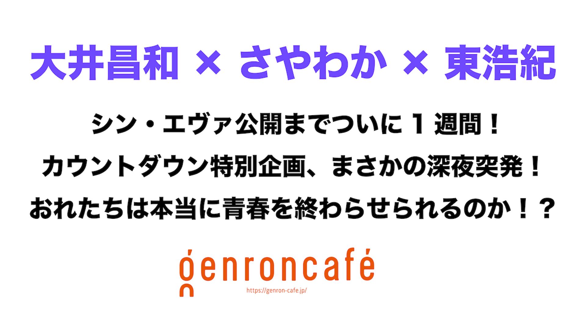 [su_spacer size="30"]【2021/3/1収録】 大井昌和×さやわか×東浩紀 「シン・エヴァ公開までついに1週間! カウントダウン特別企画、まさかの深夜突発! おれたちは本当に青春を終わらせられるのか!? 」 公開日を目前に、『シン・エヴァ』は果たしてどうなるのかを予想する突発放送はこちら! この時の予測は果たして当たるのか…!? レビュー放送とあわせてのご視聴もおすすめです。