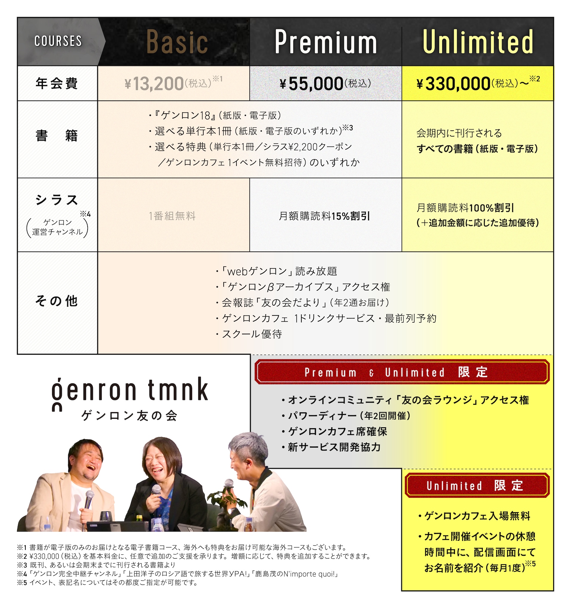 パワーディナーは上級会員限定の交流会です。年2回開催され、代表の上田洋子と創業者の東浩紀が参加し、さまざまな職種・年齢の会員のみなさんと交流を深めることができます。ゲンロンの企画ですので、時間もたっぷりとお取りします。15期では24年冬と25年初夏に開催される予定です。