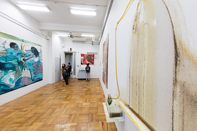 磯村 《Earthlings#4》は藝大卒業後、新芸術校に入ってから制作したものです。循環する液体とそれに溶けた物質で現象的に絵画が「できてくる」というのは、シリーズとして制作しています。 《Earthlings#3》は壁に描かれた地球人の絵が、循環しながら流れ続ける水に溶け、水に溶けた絵の粒子が循環する間に徐々に壁に染みをつけていく作品で、卒制提出後、卒業前というタイミングで作りました。このシリーズとして一番最初のものは、壁上に緑茶を流し続けて大きな茶渋をつける装置で、絵を描く意味、そしてぼく自身が描くことの意味を考え始めた4年生になったばかりのときのものです。膨大な時間のなかで、絵も自然に生まれてくるもののひとつにすぎないという思いで作りました。