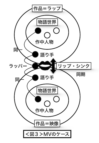 その「リアル」を考察するにあたって援用したいのは、ナラトロジー分析の手法だ。『物語のディスクール』で物語分析の議論を大きく前進させたジェラール・ジュネットの提唱する理論によれば、一人称の語り手が登場する小説の場合、小説という「作品=テクスト」の中には、「語り手」と、彼によって語られる「物語世界」が存在する。このとき「語り手」は、あくまでも「物語世界」の外側(物語世界を絵画だと例えるなら、語り手が属す領域は額縁のようなもの)に存在することになる。そして「作者」というのは、当然ながらこの「作品=テクスト」の外側に位置する存在だ[図1]。ラップの場合は、この「作者」の位置を「ラッパー」が占めることになり、小説における「作品=テクスト」は、「作品=ラップ」に置き換えられる。
