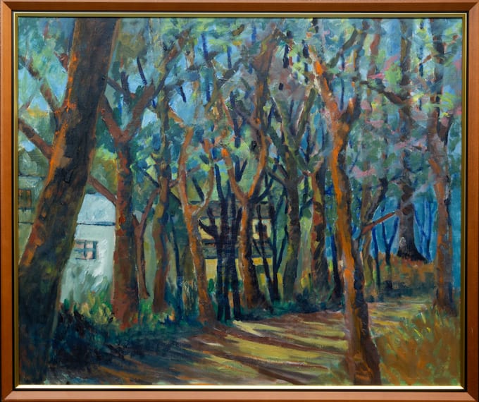 宮崎洋子(1951年生まれ、神奈川県出身)による《多摩の森》は、多摩の公園を描いた風景画だろうか。木立の間からは民家らしい建物が確認できる。並木道の地面に落ちた木々の影はのっぺりとした色彩の帯を形成し、鑑賞者の視線をジグザグと画面の右奥に誘う。木々の際の随所にキャンバス地が確認できることから、この作品がいかに手早く、そして少ない手数で計画的に仕上げられているのかが伺える。軽快だがどこかよそよそしく、即興的でありながらなんらかの法則性に従って冷静に、時にぞんざいに配されている。画面に近づいて見ていくと、タッチの1つ1つの単位が造形の1単位であることに気づかされる。そんな特徴から、いやおうなくポール・セザンヌやモーリス・ド・ヴラマンクが脳裏に浮かぶ。そしてこのタッチは図像のディテールの再現描写に貢献しないばかりか、印象派のような光学的な秩序とも距離をとっていることがわかる。色彩は目で見た風景の固有色を起点にしながらも、作品内で設定された色彩設計に準じている。木々に日光が当たっている部分には不透明で彩度の高いオレンジが採用されており、暗い色調で描かれた木々のパートにはプルシャンブルーのような透明度の高い染料系の絵の具が用いられている。のちに作家本人から聞いて驚いたのだが、この作品は宮崎にとって2枚目の油絵らしい。さらに宮崎はセザンヌを知らなかったのである。むろん、美術館や図版でなんとなく見ていた可能性は高いが。セザンヌのような、わたしたちが普段から見たり言及したりする大きな固有名が優れた画家であったことは疑いようもない。しかし、実はセザンヌ級の精度の演算を有した水準の作品は、わたしたちの知らないところでしばしば誕生しているかもしれないのである。それも、もしかしたら全国の市町村ごとに数人くらいの割合で……というのは大げさな考えだろうか。宮崎はパープルーム予備校の近所にある公民館の絵画サークルで活動している。