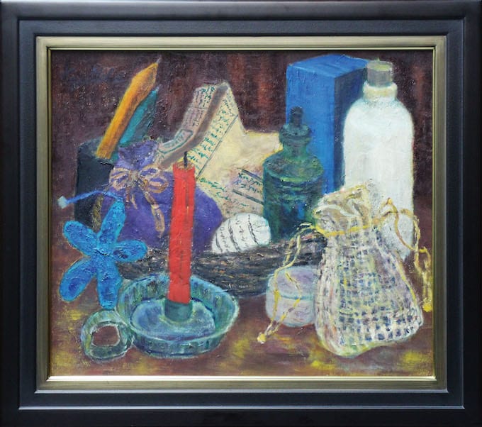 内田一子(1947年生まれ、東京都出身)による《ローソクのある静物》は遠目で見るとオーソドックスで親しみやすいありふれた卓上静物の作品のようである。マルーンの背景、『セサミストリート』に登場するクッキーモンスターのような鮮やかな青のヒトデ型のもの、青みがかった紫の巾着、真っ赤なキャンドルなど、モチーフの持つ色の再現性を超えて見る者の心理を刺激するようなシチュエーションを作り出す色のあしらい方に息を飲む。さらに、この小ぶりのキャンバスにはとてつもない情報量がぎゅっと詰まっているのである。内田が描いた静物のモチーフは、レリーフのような起伏を生み出している。そしてそれぞれのモチーフごとに違うテクスチャーが付与されているが、さらに目を凝らすとより広大な表面積を有していることがわかる。それはたんに絵の具が凹凸のある絵肌を形成しているだけではなく、軽石の表面のような多孔質の複雑な表面をかたちづくっているのだ。油絵の具は鉱物や土や染料を油で練って作られるが、それらの物質が結合し新しい化合物が生まれる様子を拡大し再現しているかのようだ。内田の作品の上ではそんなことが起こっている。