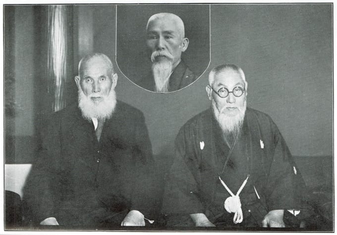 イブラヒムと頭山満。中央は内田良平 出典=『回教世界と日本』、第2版、1937年、図版6頁