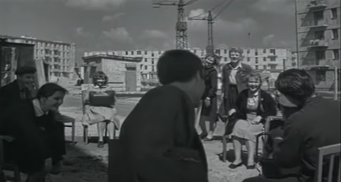 現代ロシア人にとってのフルシチョーフカは、老朽化が激しく、断熱や防音などの性能に劣り、インフラは脆弱で、デザインは画一的、なにより狭すぎる、とすこぶる不評である。スラムを意味する単語トゥルショーバ(трущоба)とフルシチョーフカをかけて、フルシチョーバ(хрущёба)という蔑称で呼ばれることもある。実際現在のロシアの都市部では、フルシチョーフカの解体が続々と進められている。それでも、長らくバラックやコムナルカの超過密空間で生活せざるを得なかった1950年代のソ連人にとっては、フルシチョーフカへの引越しはまさに夢の実現だった。この「大引越し時代」の希望に満ちた雰囲気は、たとえばユーリー・ライズマンの映画『もしそれが愛なら? А если это любовь?』(1961年)の冒頭の場面に活写されている。このシーンでは、建設中(後方にクレーンが見える)の新興団地の子どもたちが、住宅地を横切って学校から家へと帰っていく。その途中で今まさに引越し作業中の現場に行きあたって、彼らはおしゃべりしながら搬入前の椅子にめいめい勝手に腰かける【図1】。しかしそれを見た新しい住人の女性は、怒るどころか笑顔で歓迎し、子どもたち(彼らも最近引越してきたばかりのはずだ)も「引越しおめでとう!」と彼女に明るく声をかける。同作に限らず、この時期のソ連メディアでは、建設現場と若者のイメージが頻繁に結びつけられた。例えば、まだ道路の舗装もされていない建設現場で結婚式を挙げている若いカップルを描いたユーリー・ピーメノフの《明日の道での結婚式》(1962年)は、ソ連の切手のデザインにも採用されている[★8]。その最たる例は、モスクワとシベリアでそれぞれ建設に携わる青年たちを主人公にした、ゲオルギー・ダネリヤ監督の映画『僕はモスクワを歩く Я шагаю по Москве』(1964年)だろう。同作の背景には、今まさに建設中のモスクワが次から次へと登場する。フルシチョフによる政治統制の一時的な緩和──いわゆる「雪解け」──とともに、新しい時代、建設の季節が到来したのである。
