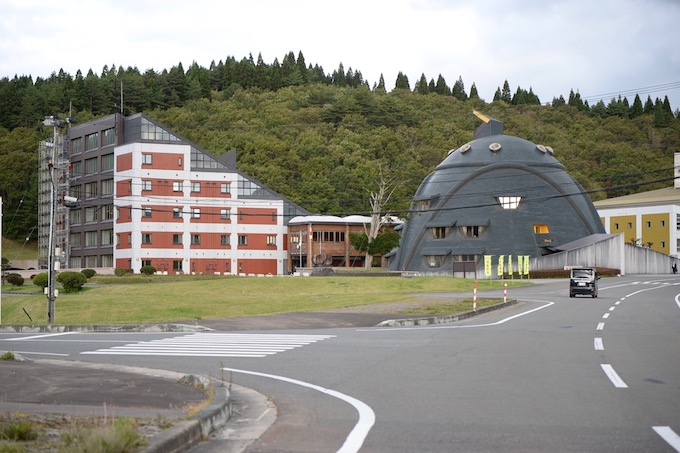 小学校の脇には、ヘルメットのような形と言えばいいだろうか、茶碗をひっくり返したような形と言えばいいだろうか、とにかく異様な形状をした建物があった。さらにその隣には、三角形をした木材工芸品のような色合いの建物もある。なんの建物だろう。キャンプのテーマパークか、いや、合宿所か。デザインが奇抜だから建築デザインを学ぶ大学の研究室か、とも考えたが、目の前の道路標識に「←東通村役場」と書いてある。地方に行くと役場だけ立派だというところも多いから特段驚くようなことではないのかもしれない。けれどもこのデザイン。工事の費用はかなりのものだろう。何しろ建物の形が四角ではないのだ。