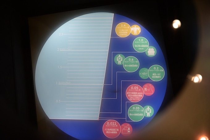 だが、ある展示の前で足が止まった。放射線の被曝量を示す展示だった。海外旅行なら何ミリシーベルト、普通に暮らしていれば何ミリシーベルトで、原発作業員なら何ミリシーベルト。イラストや図と共に、放射線というのは日常にあるものなのだから、みんなどこかで被爆している。科学的に見ていけば安心できる。そんな展示だった。