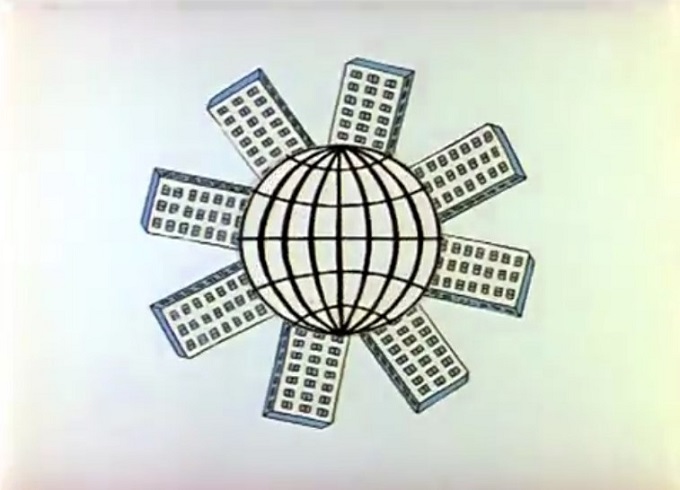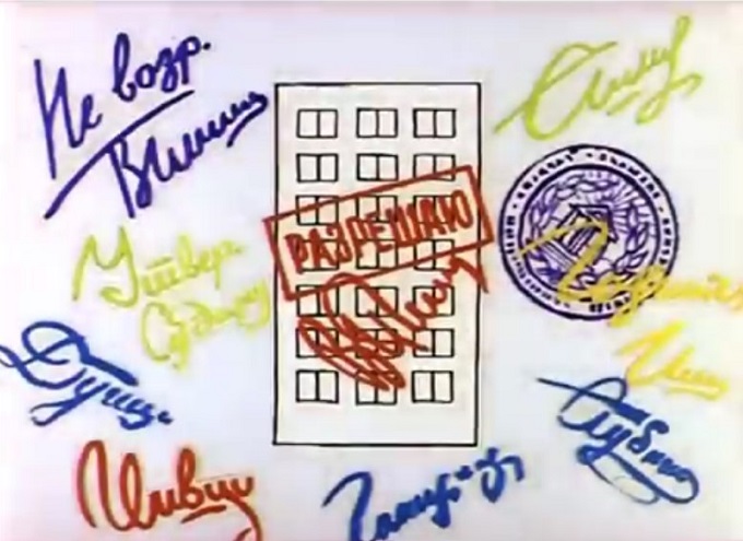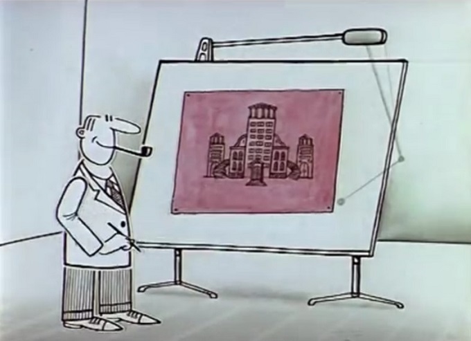 オープニングの冒頭で登場するのは、今まさに住宅を設計中の建築家。彼はスターリン様式(社会主義リアリズム)風の装飾的な集合住宅の設計図を完成させる【図3】。だが彼がこの住宅の建設許可を得るために役所の各部門をめぐればめぐるほど、設計図からは装飾的なディテールが削除されていく。結局最後に残ったのは、ただの白い箱と化した住宅と、各部門の責任者の署名だけだった【図4】。ついで、この完全に規格化された集合住宅がソ連各地に建設され、さらには砂漠から極地まで地球全体を覆っていく【図5】。そしてアニメーションは実写へと切り替わり、「今ではほとんどすべてのソ連の都市に、それぞれのチェリョームシュキがあります」というナレーションとともに、規格化された住宅からなる現実のベッドタウンが映し出される【図6】。チェリョームシュキとは、フルシチョーフカの回で取り上げた、モスクワ南西部にある実験団地のことを指している。つまりここでは、官僚的なシステムが個性的で装飾豊かな集合住宅を殺し、無味乾燥な団地の四角い箱を量産したことになっているのである。