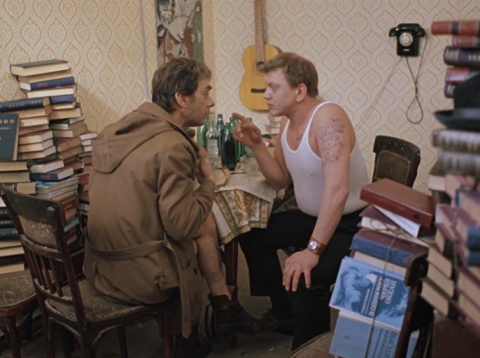 それに対して、カテリーナが惹かれるようになる変わり者の男ゴーシャが暮らすのは、やはりコムナルカだ。彼の住む部屋では、窓はカーテンではなく新聞紙でふさがれ、小さなテーブルと椅子以外、家具らしい家具は存在しない。代わりに床には大量の本が積み上げられ、壁にはシャガールの絵が飾られ、あるいはギターが立てかけられている【図12】。まるで都会に住まう隠者の隠れ家のようだ。リーダと同じく、単身者のゴーシャにとって団地の住まいを獲得するのが至難の業であることはもちろんだが、これらの住まいの様子は、彼が物質的な豊かさや快適さにそもそも大して興味を持っていないことを示している。彼にとっては、文学や芸術がそれらに優先するのだ。そしてまさにこのようなゴーシャの性格ゆえに、カテリーナは彼に惹かれていくのである。