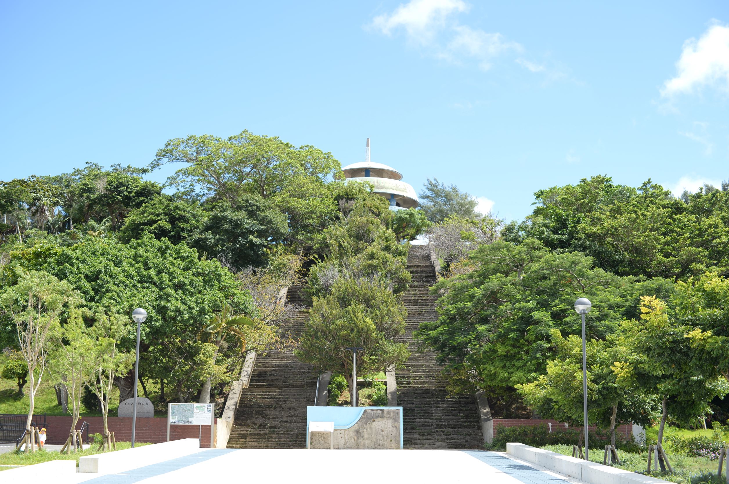 車は那覇市を北上し宜野湾市へと入った。最初の目的地が嘉数高台公園だ。ユマちん曰く「沖縄の教育旅行の総本山みたいなところ」だという。車を降りると、目の前にこんもりとした丘がある。その頂上には、少し年代を感じる、青く塗装された展望台があるのが見えた。