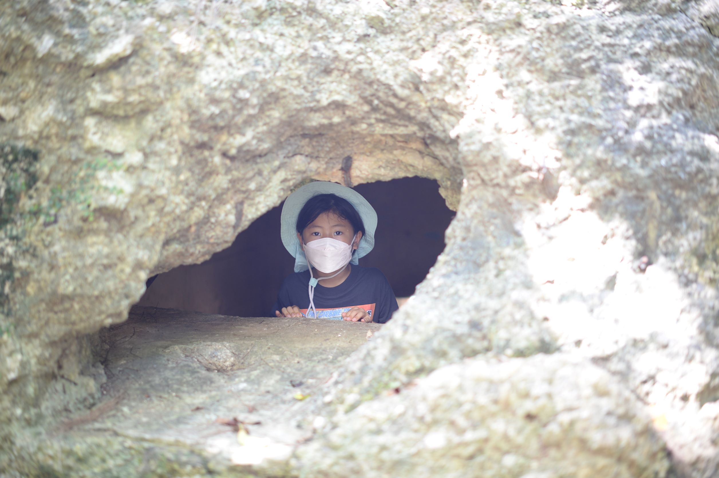 トーチカのそばには、日本軍が使っていた陣地壕の跡がそのまま残されていた。陣地壕は石灰岩質の地面に穴を掘り、くり抜いて作られた日本軍の陣地だ。現在は入り口が封じられているので中に入ることはできないが、この暑さのなか細い壕の中を動き回り、身を潜め、米軍と対峙していた兵士の姿を想像することならできた。ユマちんによれば、嘉数地区には無数の陣地壕が作られ、その構築には多くの住民も駆り出されたという。「地元の住民も日本軍の駐留を歓迎したんです。家に泊めたり、一緒になって陣地壕の穴を掘ったり。でもその結果、日本軍はアメリカ軍に情報が渡るのを恐れていました。そのため撤退するときに自害することを求められた住民も多かったそうです」。住民と兵士たちの距離の近さ、関係の濃密さが、不幸にもさらなる悲劇をもたらしたのかもしれない。