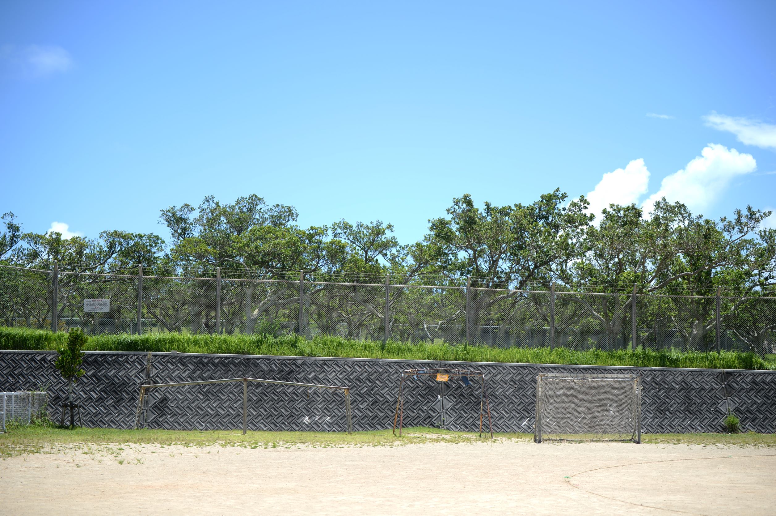 保育園を後にしたぼくたちは、そのまま住宅地を進み、普天間第二小学校の前で車を止めた。目の前の風景は、ちょっと信じがたいものがあった。学校のすぐ隣が、先ほど高台から見た普天間飛行場なのだ。その証拠に、学校の敷地の端にフェンスが建てられている。そのフェンスを越えれば米軍基地なのである。あらためて距離の近さを実感する。校庭にも、そのフェンスは伸びていた。小学生が体育の授業をしたり、休憩時間に遊んだりする、そのすぐ脇に飛行場があるということだ。