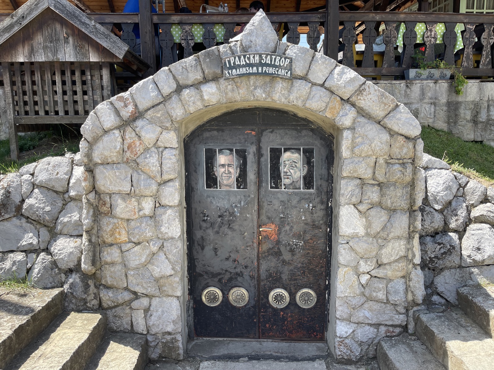 頭を悩ませたのだが、結論から言えば、この壁にしろ前述の通りや広場の名前にしろ、単にクストリッツァが好きなものを集めただけだと理解するのが正解だろう。政治性がありそうでない、ただそれっぽいだけというこの中途半端な性格は、園内のある倉庫の扉に描かれた風刺画にも表れている[図2]。2000年代にアメリカの正副大統領だった二人、ブッシュとチェイニーが牢屋に閉じ込められているさまが描かれているのだが、主張は曖昧だ。反米の気持ちが盛り上がるなか、悪ふざけでやったようにも見える。
