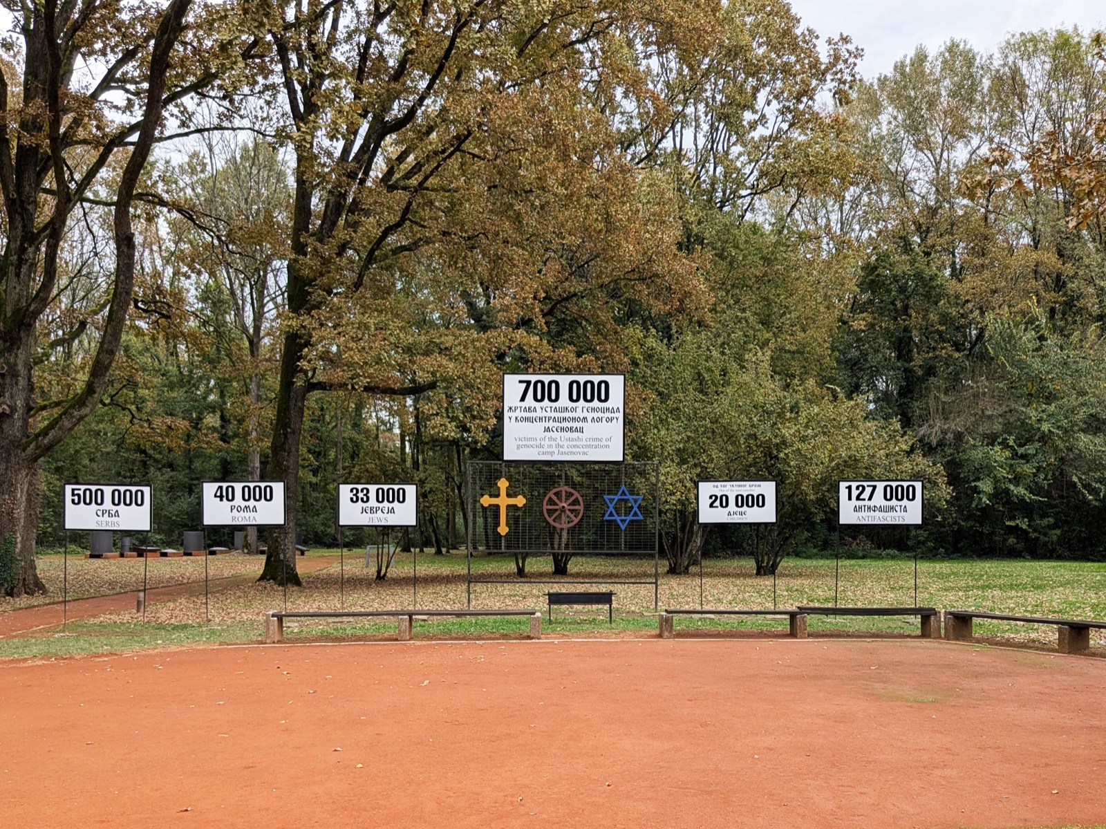 数字が大きく異なるのは、犠牲者数をめぐって論争があるからである。収容所跡地はいまはクロアチアとボスニア・ヘルツェゴヴィナ(のなかのスルプスカ共和国)にまたがっており、ともに歴史公園として整備されている。クロアチア側の博物館は犠牲者は8万人だと主張しているが、スルプスカ側に建てられた記念碑は40万という数字を掲げている[図11・12]。後者の数字は、スルプスカ共和国の首都、バニャ・ルカにある国立博物館の特別展示でも採用されている。ぼくたちはこの公園と博物館も訪れているのだが、詳しく紹介するのはべつの機会に譲ることとしよう。