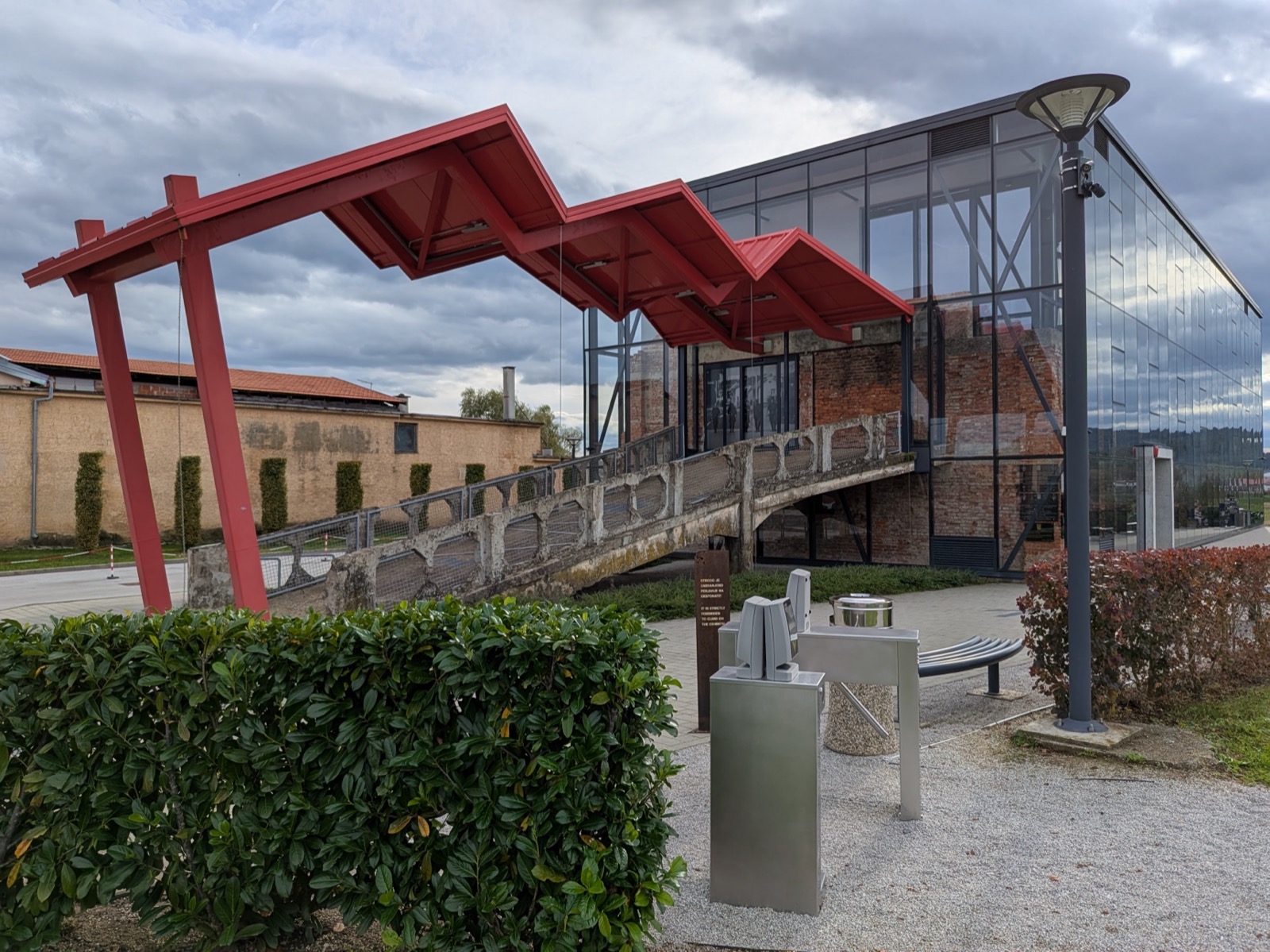 博物館の正式名称は、カルロヴァツ゠テュラニ祖国戦争博物館という。内戦で破壊された施設を改修したもので、市の中心から数キロ離れたテュラニという田園地帯に建てられている。博物館の建物は、煉瓦づくりの古い施設をガラスのカーテンウォールで包み込み、弾痕だらけの壁が覗ける構造にしたスタイリッシュなものだ[図14]。新しい博物館で、開館は2019年だ。