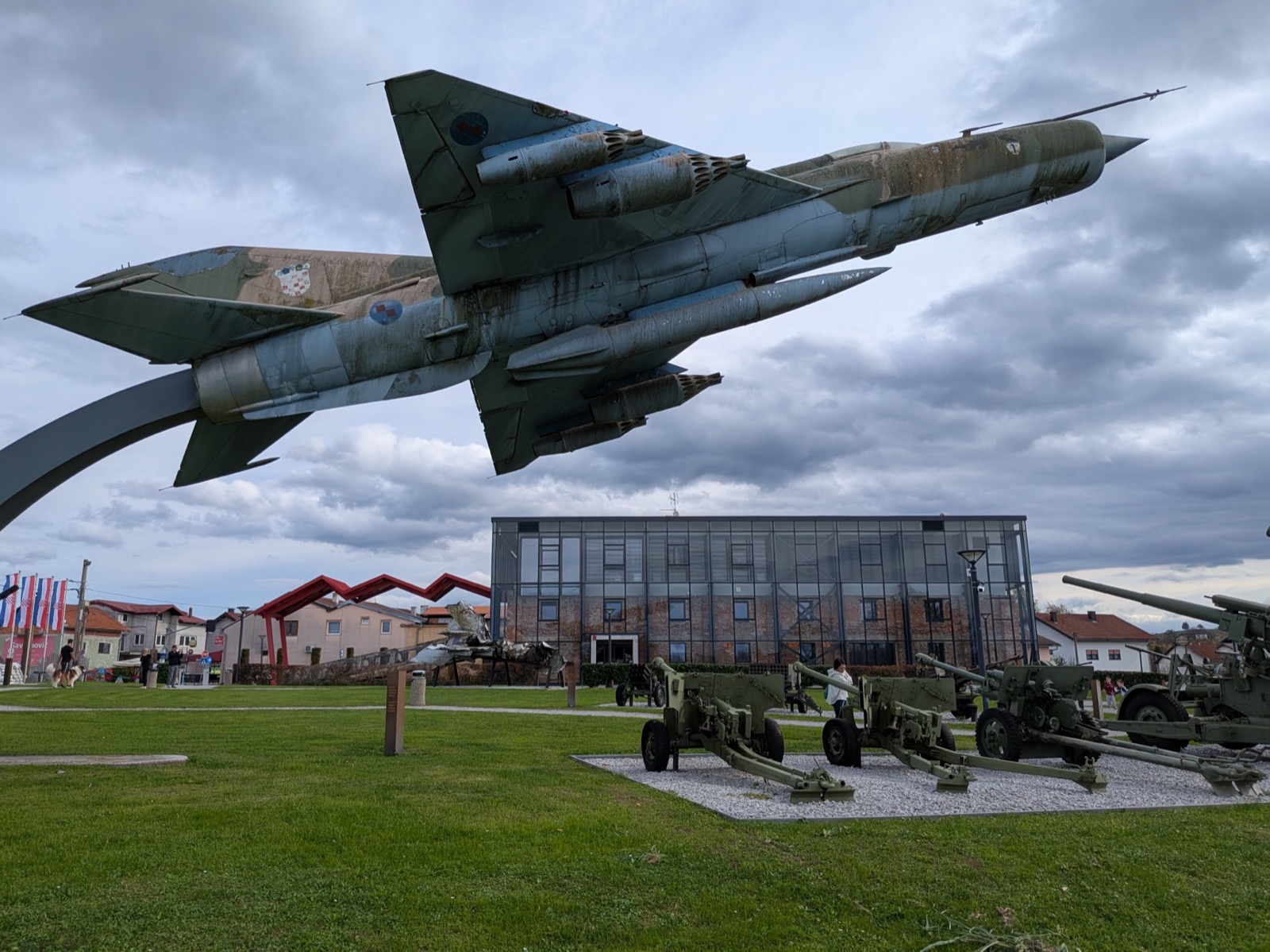 この博物館はドゥブロヴニクの博物館よりかなり規模が大きい。展示では映像やマルチメディアが駆使され、きちんと予算が投じられている。屋外展示もあり、内戦でクロアチア側で活躍した、あるいは逆に鹵獲されたセルビア側の戦車や自走砲が並んでいる。目玉は、鉄骨で支えられて、まるで空中に飛び立たんとしているかのように演出されたミグ21だ[図15]。