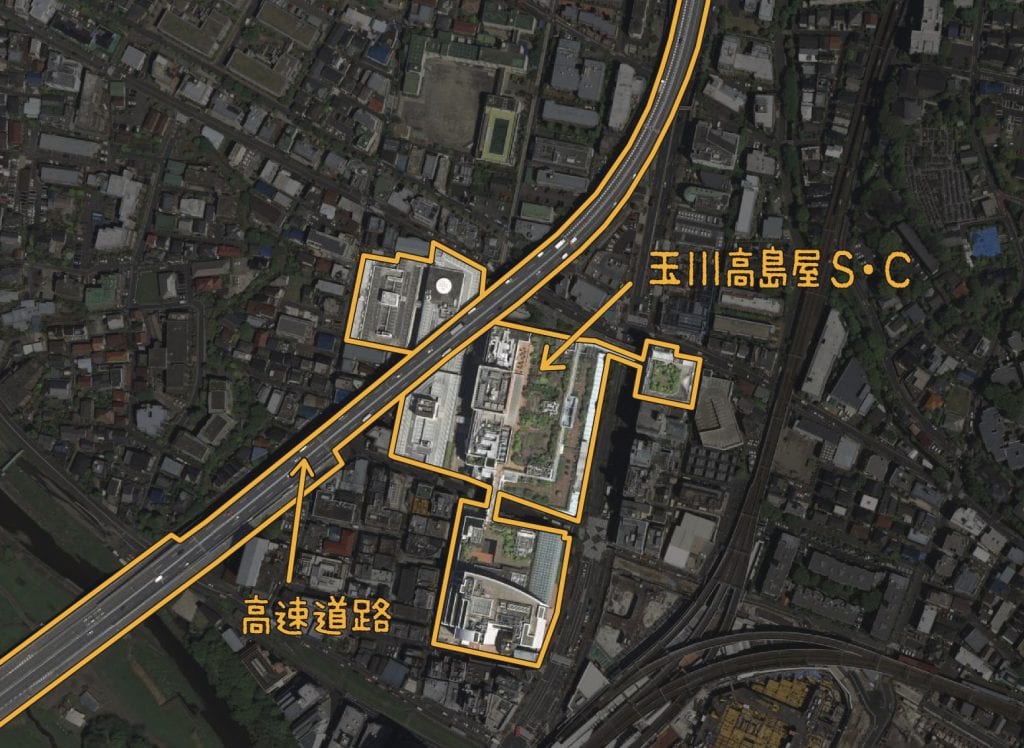 大山 違和感というか、趣味の問題ですけど。土地の文脈をどう捉えるか、という点にぼくはすごく興味があるので。この写真は、先ほども触れた玉川高島屋です【図4】。おもしろいのは、上を道路が通っているところですね。大阪にはときおり見られますが、関東には珍しい。なぜこうなっているのか調べると、行政側と高島屋側で複雑な権利の調整があったらしい。なにもない敷地に高島屋が建てられて、その後バイパスがつくられてこうなった。