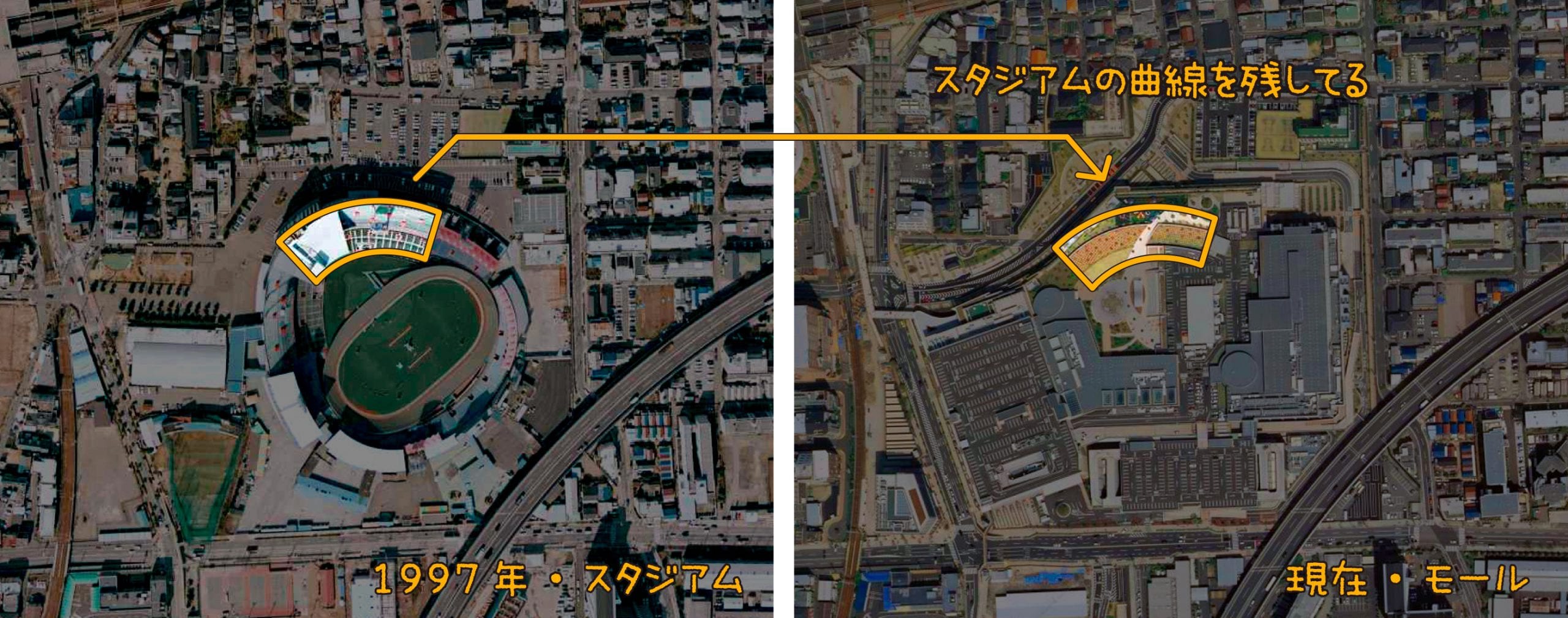 これは西宮のモールです【図5】。これはもともとスタジアムの敷地を流用しているので、ここの曲線にその痕跡が見て取れるのがわかります。先ほどジャーディを紹介しましたが、ショッピングモールをつくるひとは、たんなる商業施設ではなく街をつくろうとする。だから、その地域がもともと持っている文脈を強く意識して、それをなんとか活用しようとする。