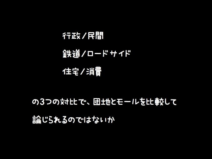 団地という点で言えば、ご存じのようにぼくはずっと団地も研究してきました。今回、ショッピングモールについて改めて考えてみて、両者は「行政/民間」、「鉄道(駅前)/ロードサイド」、「住宅/消費」の3つの対比で論じられるのではないかと思いいたりました【図2】。団地というのは国を挙げて戦略的に進められたものでした。それに対していまは、UR(独立法人都市再生機構)が団地リノベーションと言って民間と共同で再活用に取り組んでいる。ショッピングモールも同じですね。