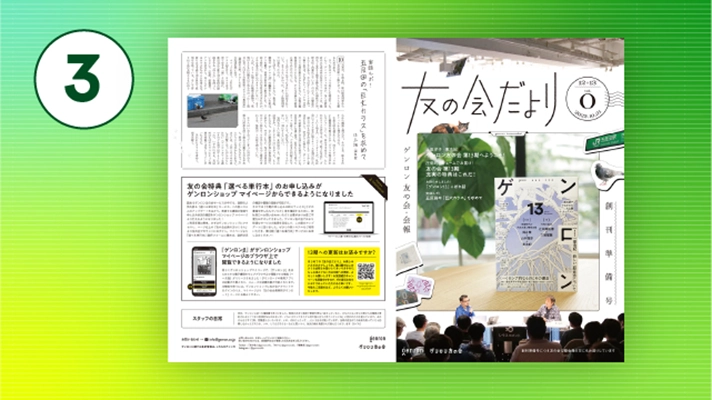 友の会だより13期より新たに紙の会報誌『友の会だより』をお送りしています。かつてコンテクチュアズ友の会でお配りしていた会報誌が、装いをあらたに生まれ変わりました。ゲンロンの近況や、スタッフによるコラム等を掲載していきます。会期中に2回の刊行を予定しており、新規ご入会者さまにはその時点の最新号よりお届けしています。